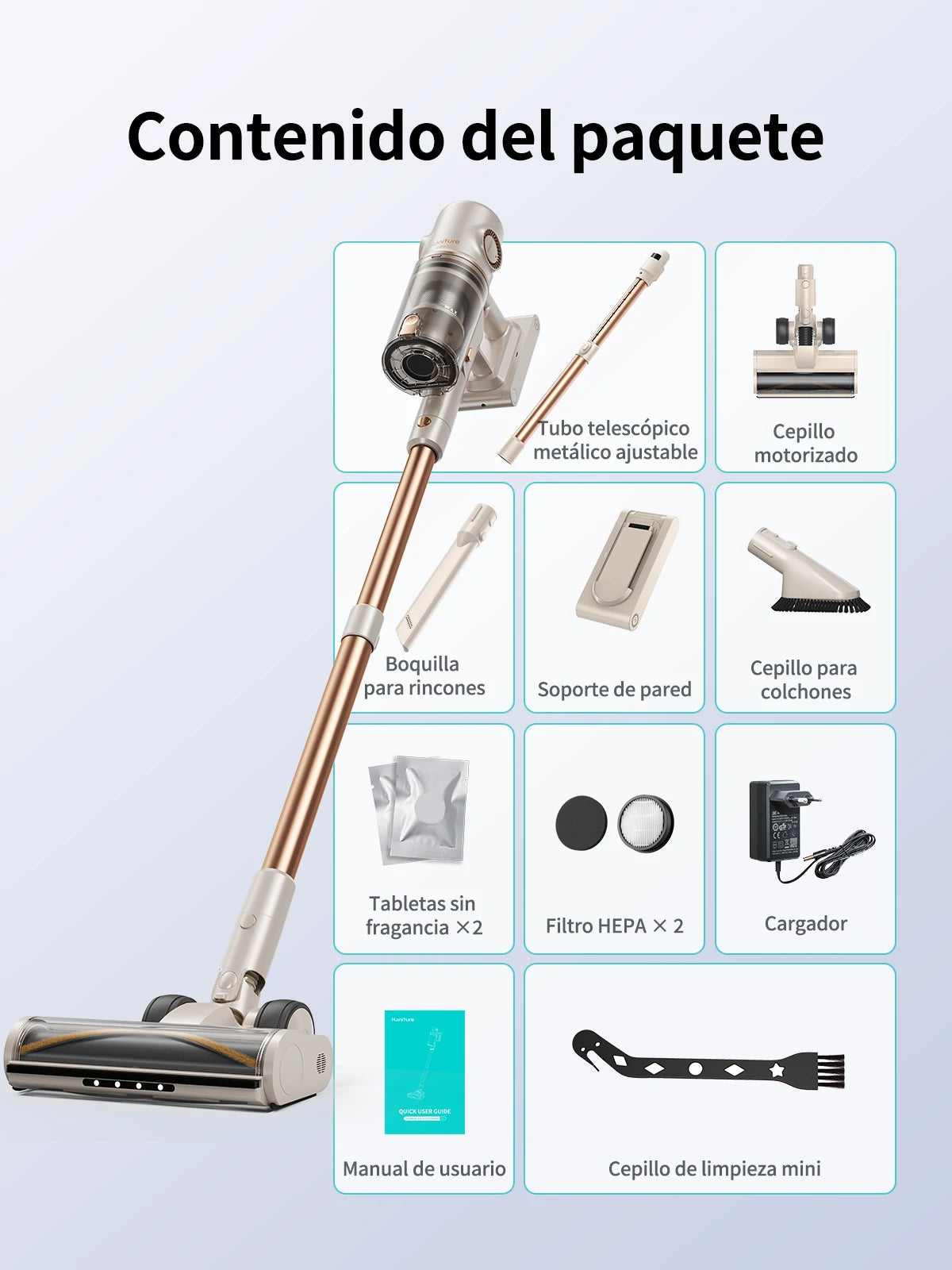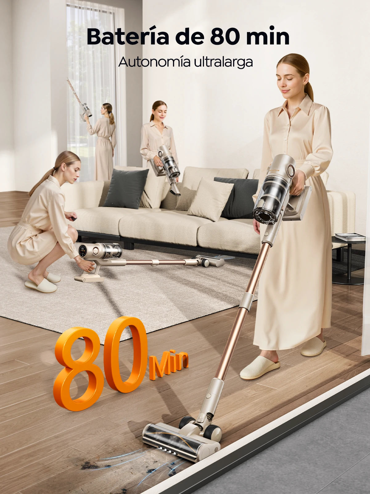 Esta aspiradora inalámbrica, con 6 baterías de 4000 mAh, aguanta 80 minutos seguidos. Suficiente para limpiar 300 m² sin pausas. ¿Y si te cansas antes que ella? Tómate un café, ve un capítulo de tu serie y vuelve a la carga: aún tendrá batería de sobra. Para casas grandes... o para quienes están hartos de quedarse a mitad por falta de batería.