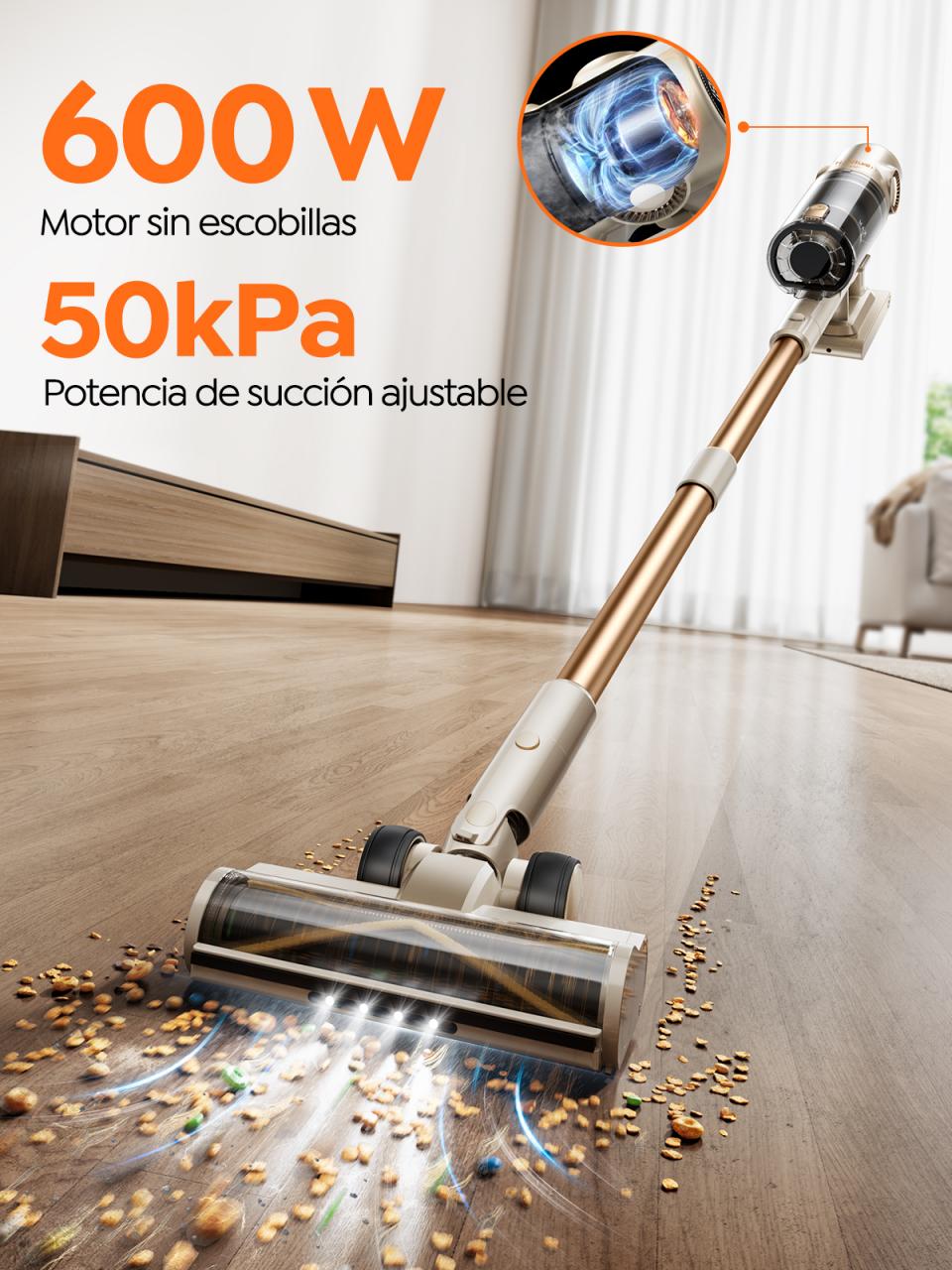 Con su motor brushless de 600 W y 50 kPa de potencia, elimina sin esfuerzo pelos de mascotas, polvo incrustado y suciedad oculta en sofás, alfombras y rincones difíciles.