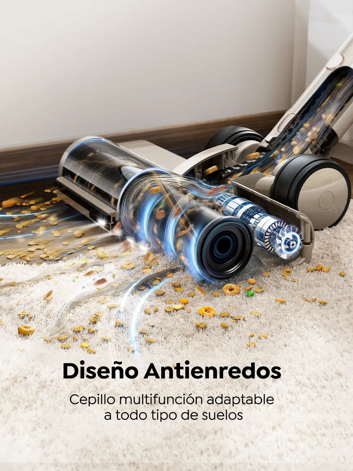 La escoba eléctrica inalámbrica Honiture P7 Pro incorpora un cepillo en V que detecta y elimina al instante pelos de todo tipo (humanos y mascotas), sin enredos. Limpieza eficaz, cero mantenimiento. Adiós tijeras, hola tecnología.