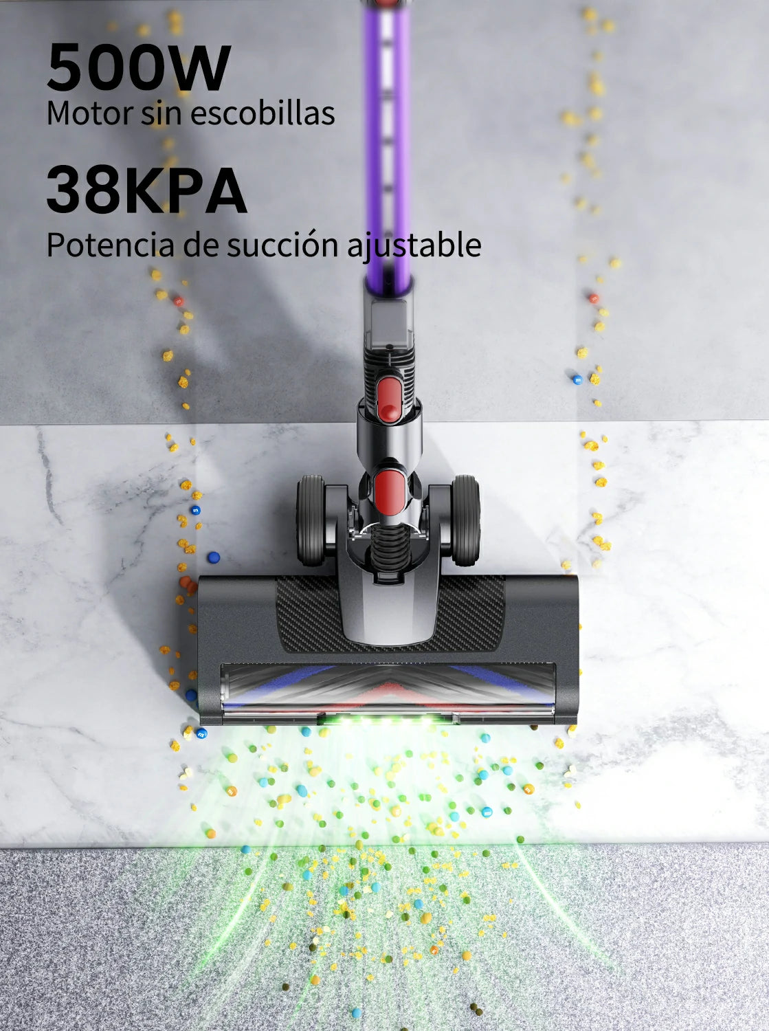 El motor brushless de 500 W genera 38 kPa de fuerza de aspiración, capaz de desincrustar el polvo oculto y retirar la suciedad atrapada en lo más profundo de tus alfombras.