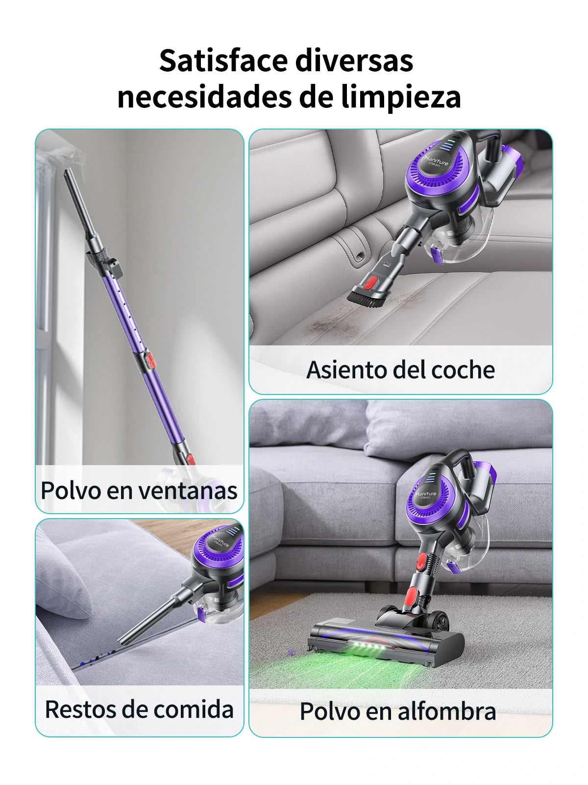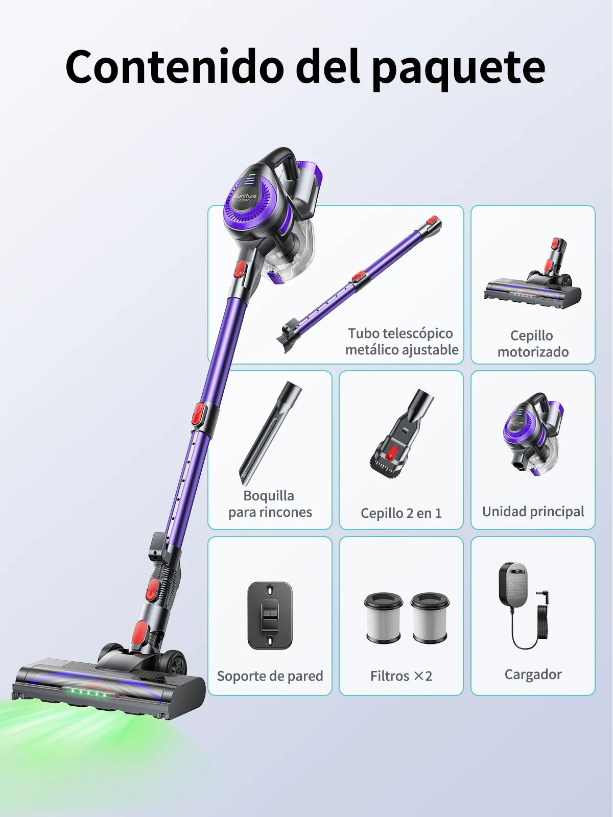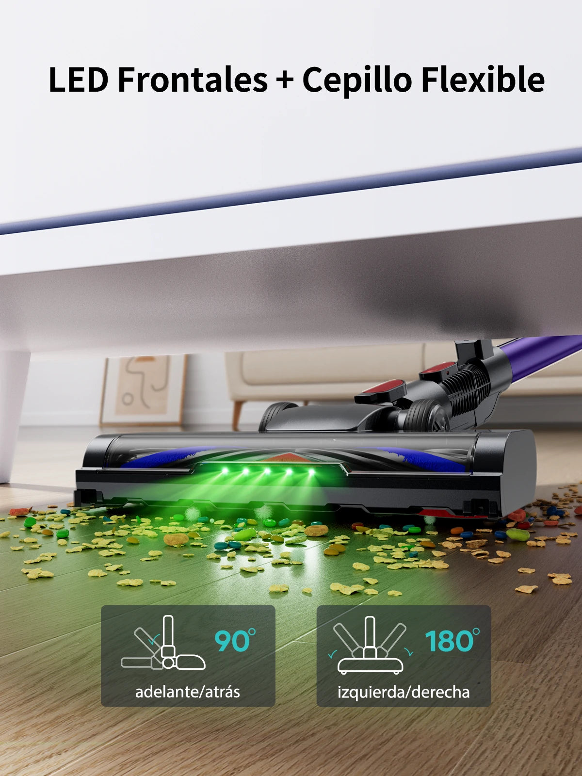 Incorpora un rodillo en forma de V anti-enredos que minimiza la acumulación de pelos. Además, el cabezal de limpieza tiene luces LED y permite rotación flexible de 90°/180°, facilitando la limpieza en espacios oscuros o de difícil acceso.