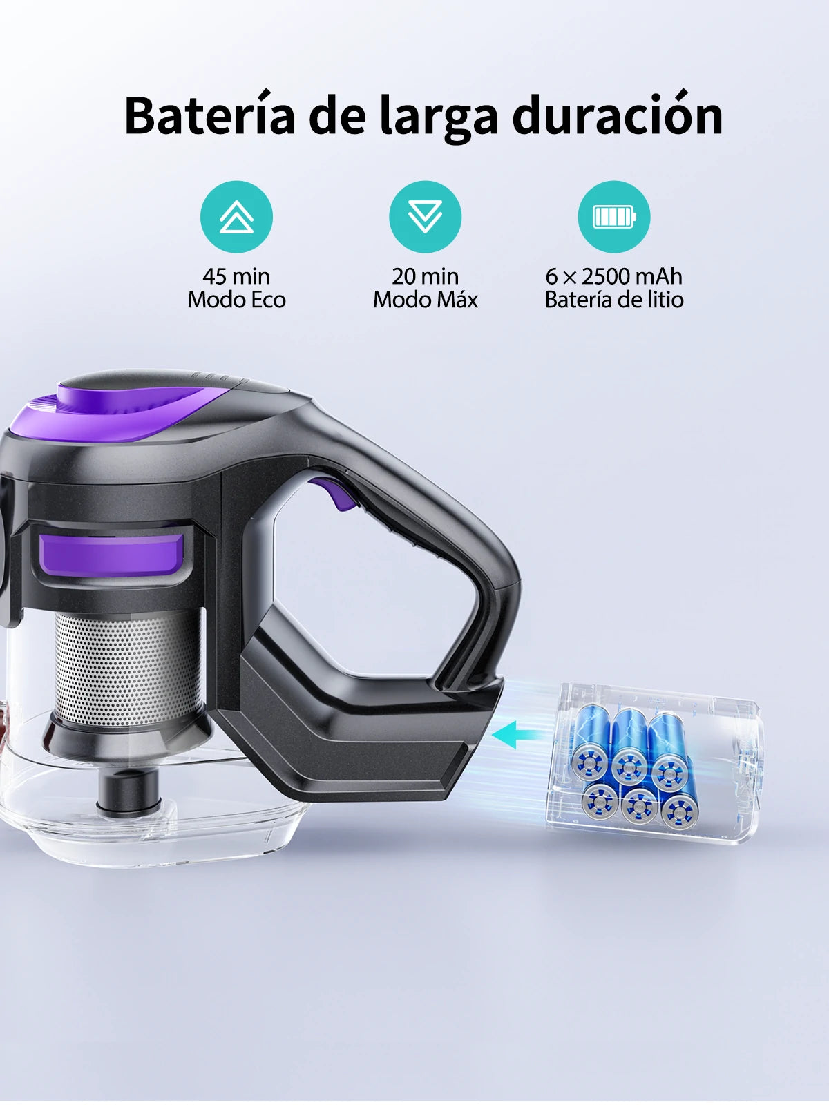 Su configuración de 6 baterías de 2500 mAh ofrece 45 minutos de uso continuo, perfecta para la limpieza eficiente de apartamentos y pisos medianos sin interrupciones.