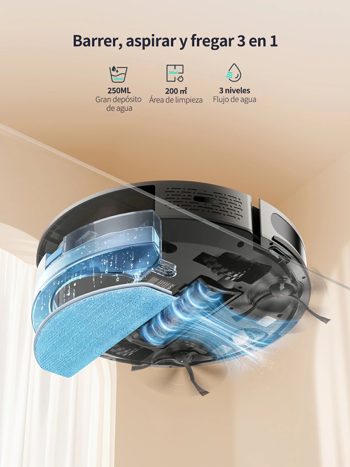 El Honiture G20 Pro alcanza una potente succión de hasta 4500 Pa, combinando funciones 3 en 1: barrer, aspirar y fregar, para una limpieza completa en todo tipo de suelos.